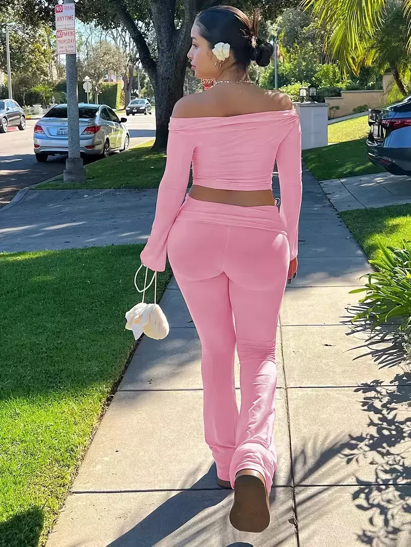 Conjunto feminino com blusa ombro a ombro de manga longa e calça. Modelo casual, confortável e versátil para uso diário.
