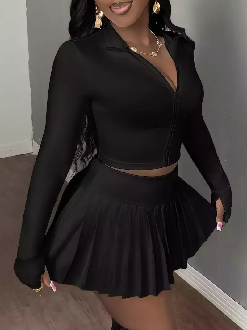 • Top casual de manga longa com gola V e zíper frontal